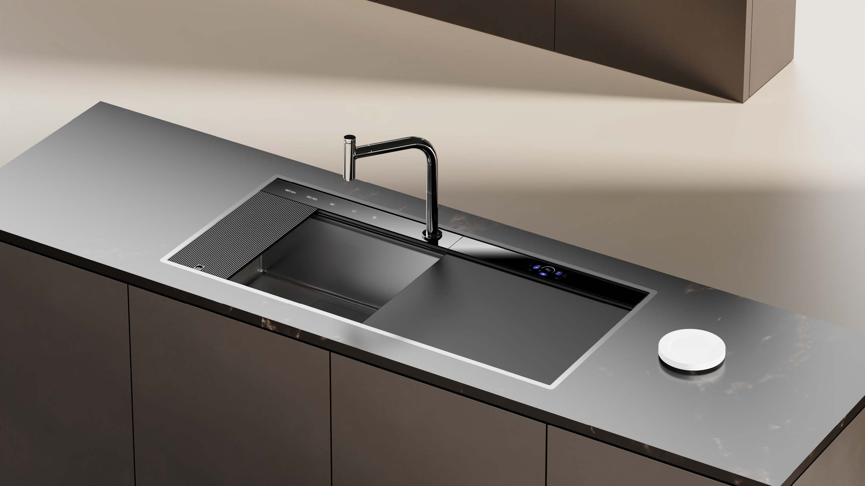 The new generation of sink dishwasher design integrates the "sink" and "wash" zones into a "one-piece operation surface." Lowering the dishwasher panel and using aerospace-grade scratch-resistant metal transforms the panel into additional countertop space for food prep and draining. This innovation enhances kitchen usability while redefining the sink dishwasher's core design. A clear distinction between digital and physical interactions reduces clutter, optimising daily operations. The horizontal digital interaction zone spans the large basin, integrating technology and setting the stage for a more intelligent, more efficient sink experience in the future.