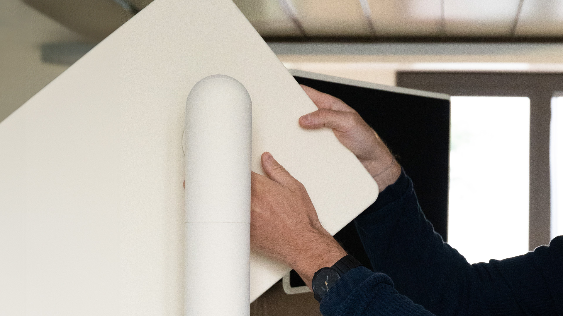 We wanted to create a truly universal OLED display that seamlessly adapts to every moment and any display activity at home - free from the constraints of today's static, single-minded displays that don't reflect the more fluid, digital lifestyle we all live. We identified many moments of modern living and translated this knowledge into intuitive mechanical principles that make transitioning between different positions and orientations effortless and user-friendly. At the same time, we maintained a non-engineered appearance to preserve the warm and inviting look and feel of the device.